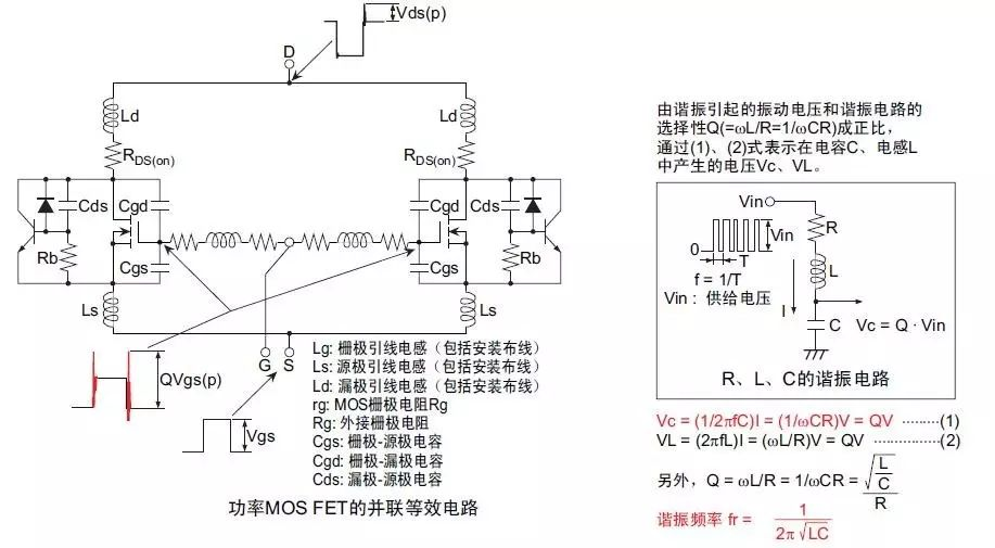 在并聯功率MOS FET時未插入柵極電阻而直接連接時發生的柵極寄生振蕩。高速反復接通、斷開漏極-源極電壓時,在由柵極-漏極電容Cgd(Crss)和柵極引腳電感Lg形成的諧振電路上發生此寄生振蕩。當諧振條件(ωL=1/ωC)成立時,在柵極-源極間外加遠遠大于驅動電壓Vgs(in)的振動電壓,由于超出柵極-源極間額定電壓導致柵極破壞,或者接通、斷開漏極-源極間電壓時的振動電壓通過柵極-漏極電容Cgd和Vgs波形重疊導致正向反饋,因此可能會由于誤動作引起振蕩破壞。