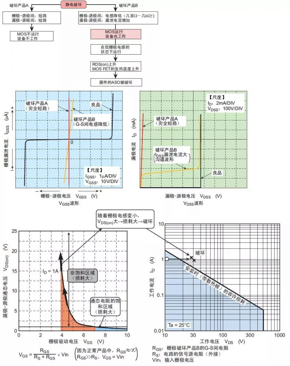 要有因在柵極和源極之間如果存在電壓浪涌和靜電而引起的破壞,即柵極過電壓破壞和由上電狀態中靜電在GS兩端(包括安裝和和測定設備的帶電)而導致的柵極破壞。