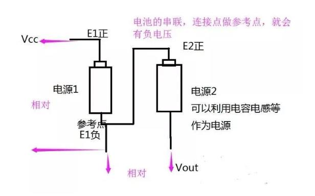 想產(chǎn)生負電壓,就讓它相對于電源負極的電勢更低即可。要想更低,必須有另一個電源的介入,根本原理都是利用兩個電源的串聯(lián)。電源2正極串聯(lián)在參考電源1的負極后,電源2負極就是負電壓了。