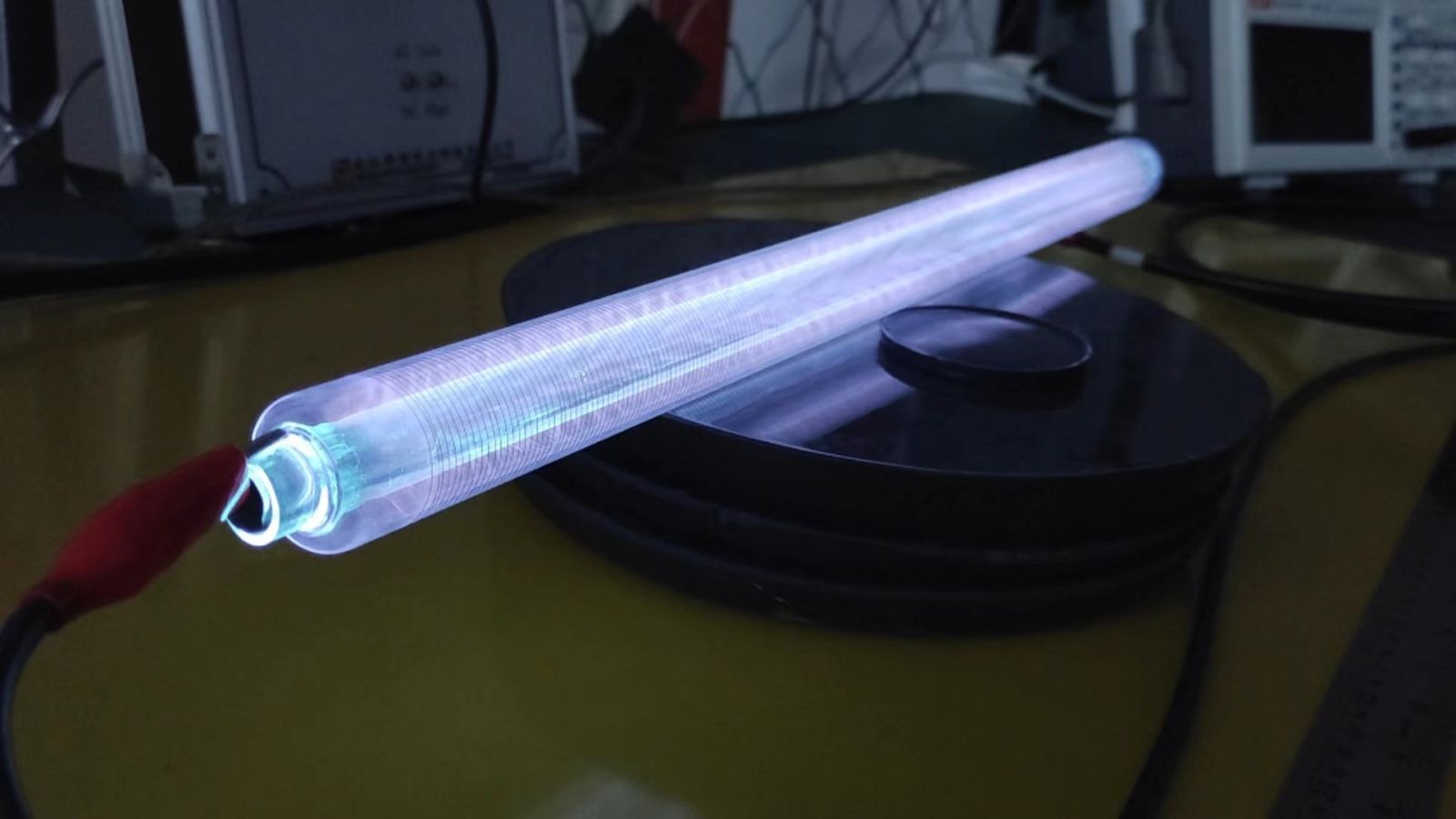 使用石英玻璃管體作為介質,使用型號為JMAC-P10-400mA定頻20kHz的高壓交流電源所產生的等離子體。